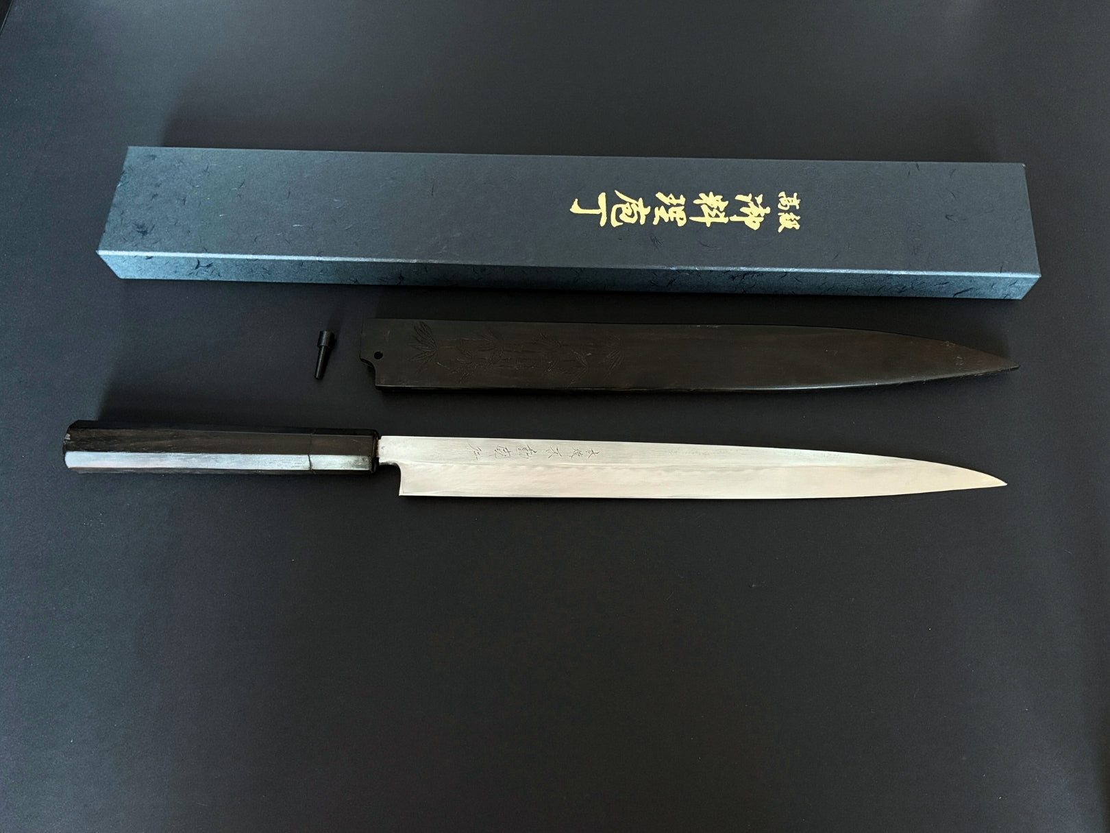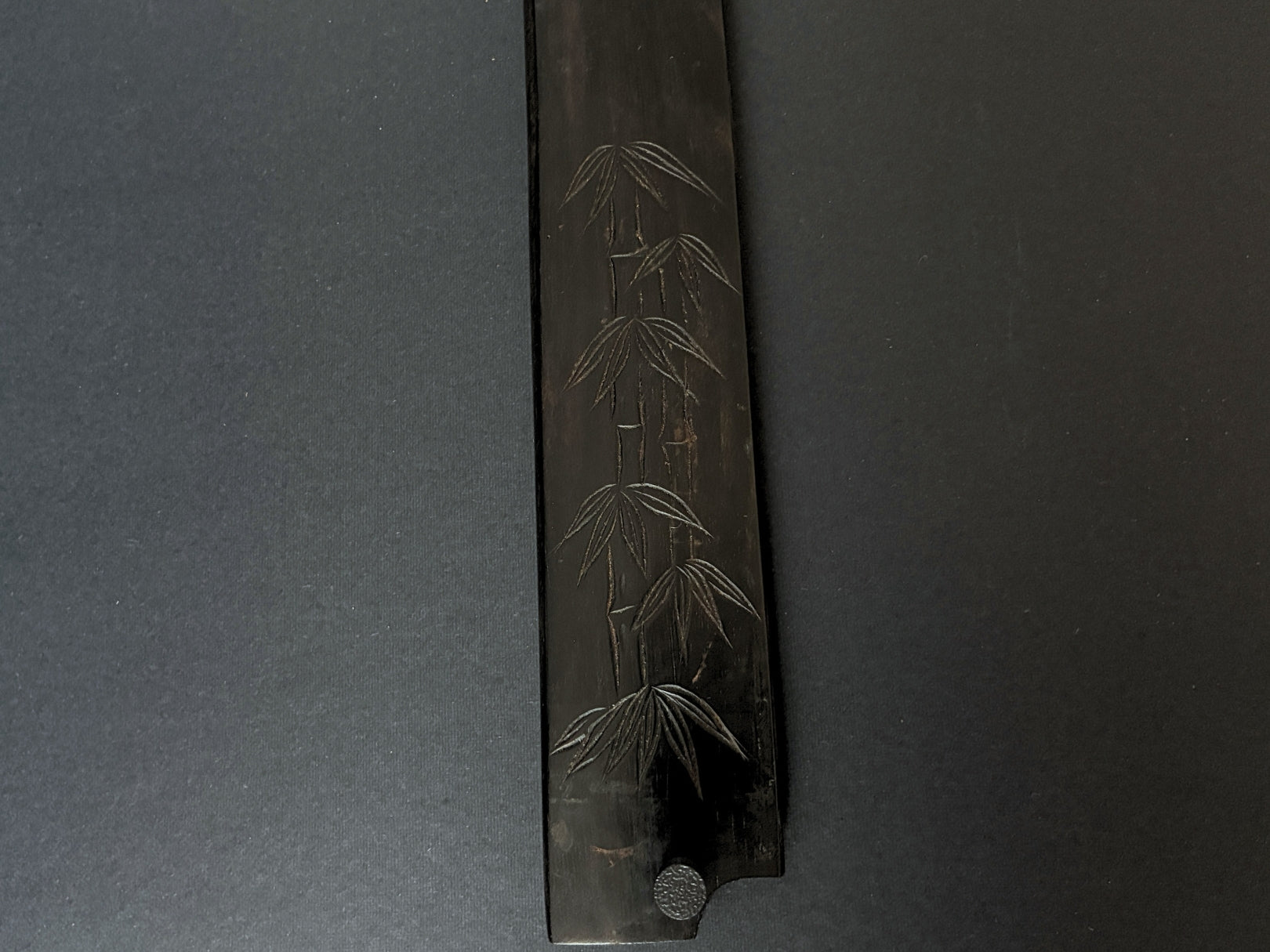 Saya (sheath): Original ebony saya with bamboo design engraving (it is often seen old Genkai Masakuni knives)