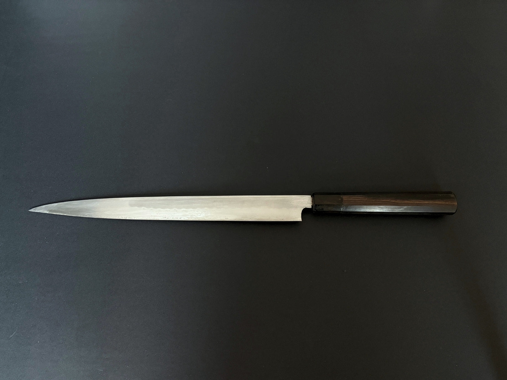 Fudo Kuniyuki (Genkai Masakuni) Mizu Honyaki Fuguhiki 11-3/4" (300mm) Blade Knife w/ Ebony Handle and Water Buffalo Ferrule and Ebony Saya